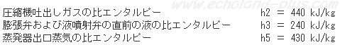 ただし、図中の点3は過冷却であり、各状態点の比エンタルピーび値は次のとおりである。