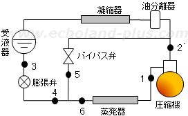 問2 R401Aを冷媒として、負荷減少時に、圧縮機出口直後の吐出しガスの一部を蒸発器入口にバイパス弁を通して絞り膨張させ、容量制御を行う冷凍装置は、下図のとおりである。 この装置において、圧縮機の吐出しガス量の15mass%をバイパスして容量制御を行っているとき、次の問いに答えよ。なお、(1)は解答用紙のp-h線図上に、(2)と(3)は解答用紙の所定欄に計算式を示してそれぞれ答えよ。