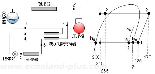 比エンタルピー hD を求めるには、蒸発器出口の冷媒の比エンタルピー h6 を求め、それを使い乾き度基本式から hD を求めます。また、ここで液ガス熱交換器の熱収支から h6 を求められないと、(3)の (COP)R を求められません。