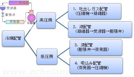 冷凍サイクルを完成させる冷媒が通る配管を「冷媒配管」という。