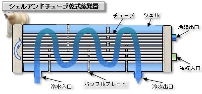 ・空調用乾式シェルアンドチューブ蒸発器は、冷媒が蓋の下側から入り蒸発しながら冷却管の中を通り反対側の蓋の中で折り返し、再び上半分の冷却管を通り蓋の上部出口から吸込み蒸気配管に出ていく。 by echo