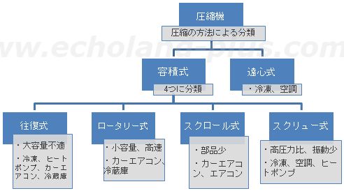 圧縮機は、冷媒蒸気の圧縮の方法により、容積式と遠心式に大別される。